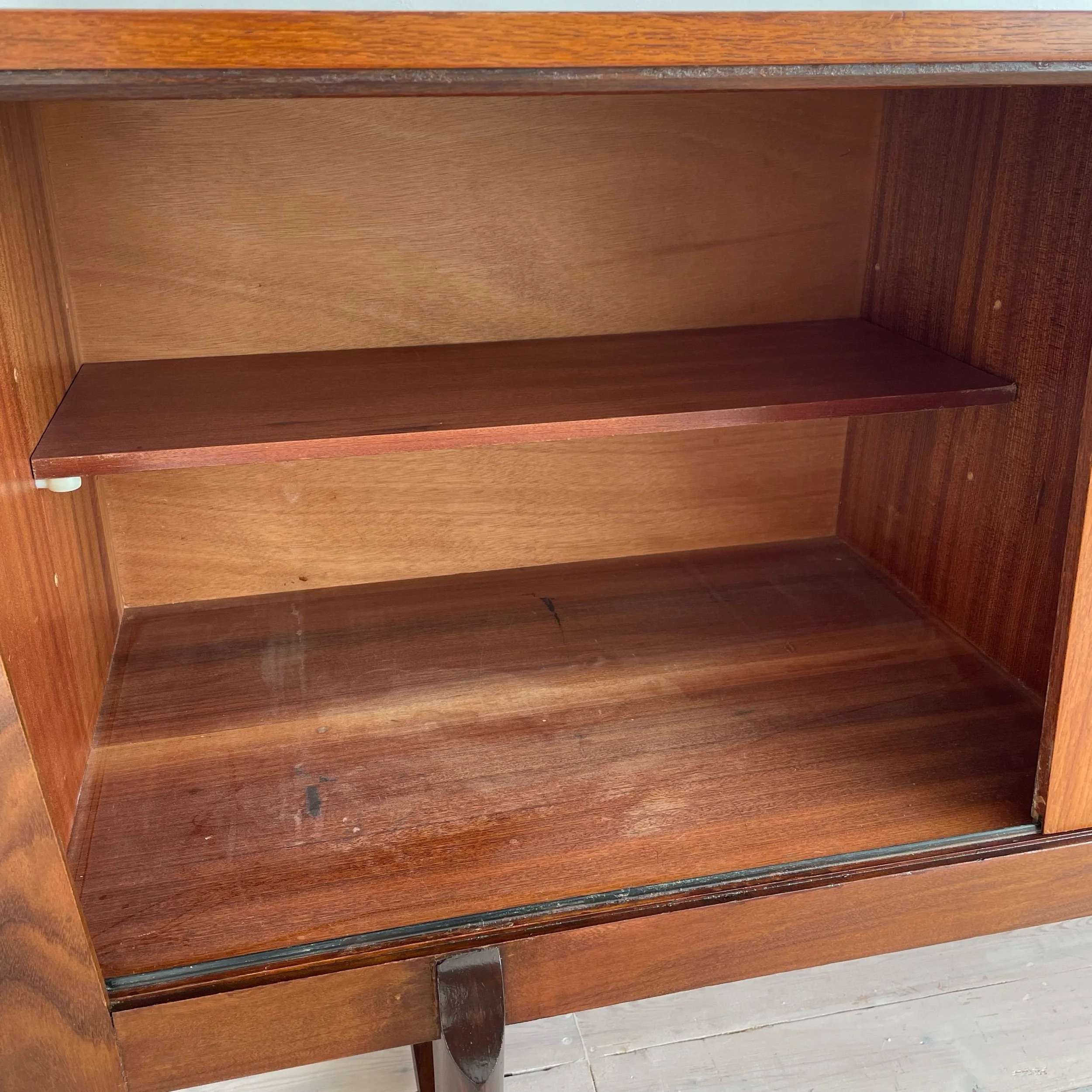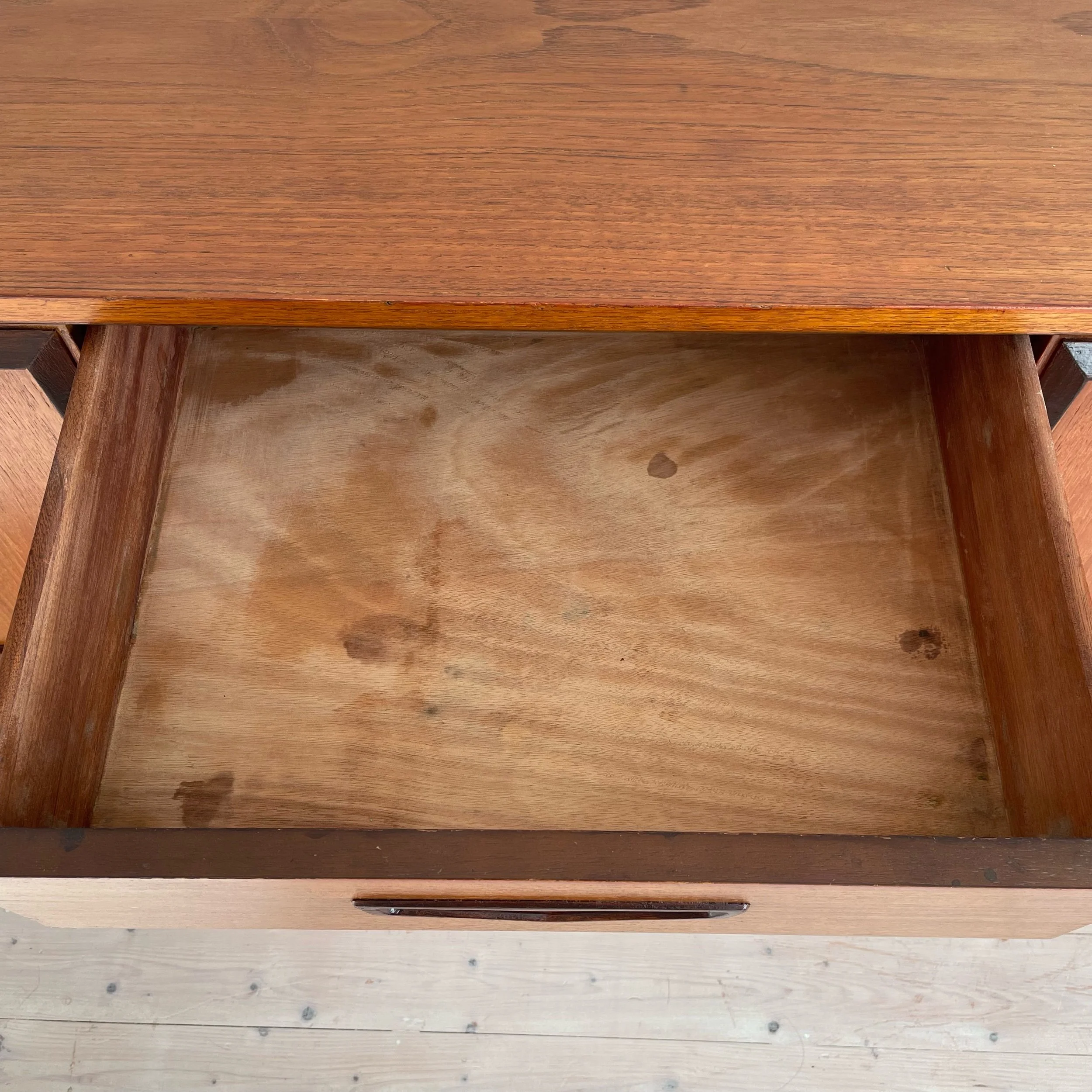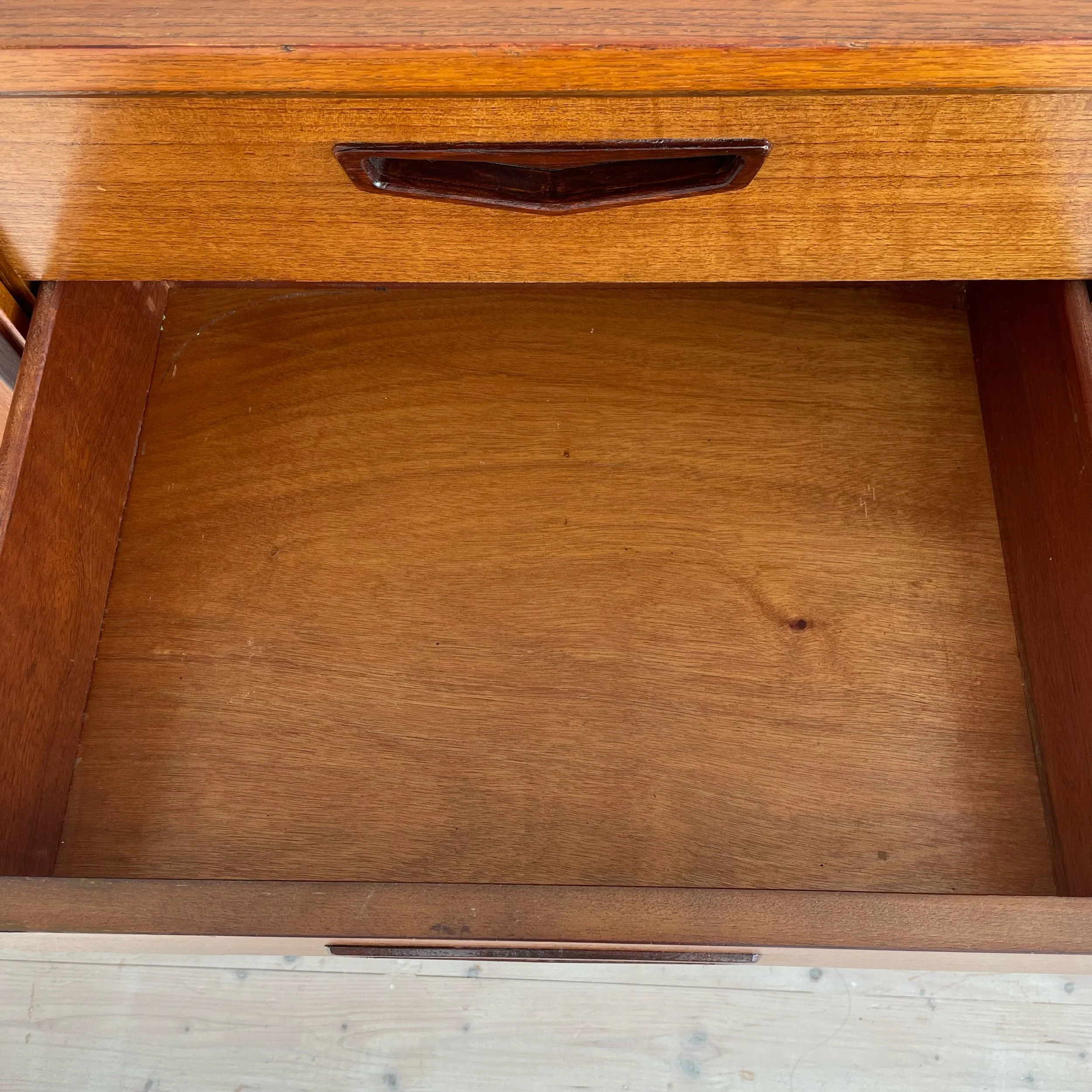 In great condition for its age, some very minor blemishes/scratches which would be expected with a piece of this age. Photographed is a slight indent to the front corner. The internals of the drawers and cupboards could do with a deeper clean or lined with drawer paper to freshen up.